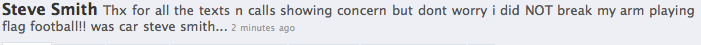 Notre Steve Smith va très bien mais son homonyme qui a longtemps fait de l’ombre à notre #12 s’est cassé le bras lors d’un match de flag football (foot sans contact – donc faut le faire pour se casser un bras…).