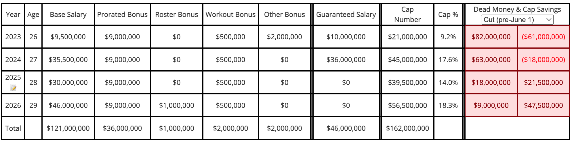 - $46M du salaire est entièrement garanti; et $23M partiellement garanti (reste à savoir si c’est pour blessure ou performance)
