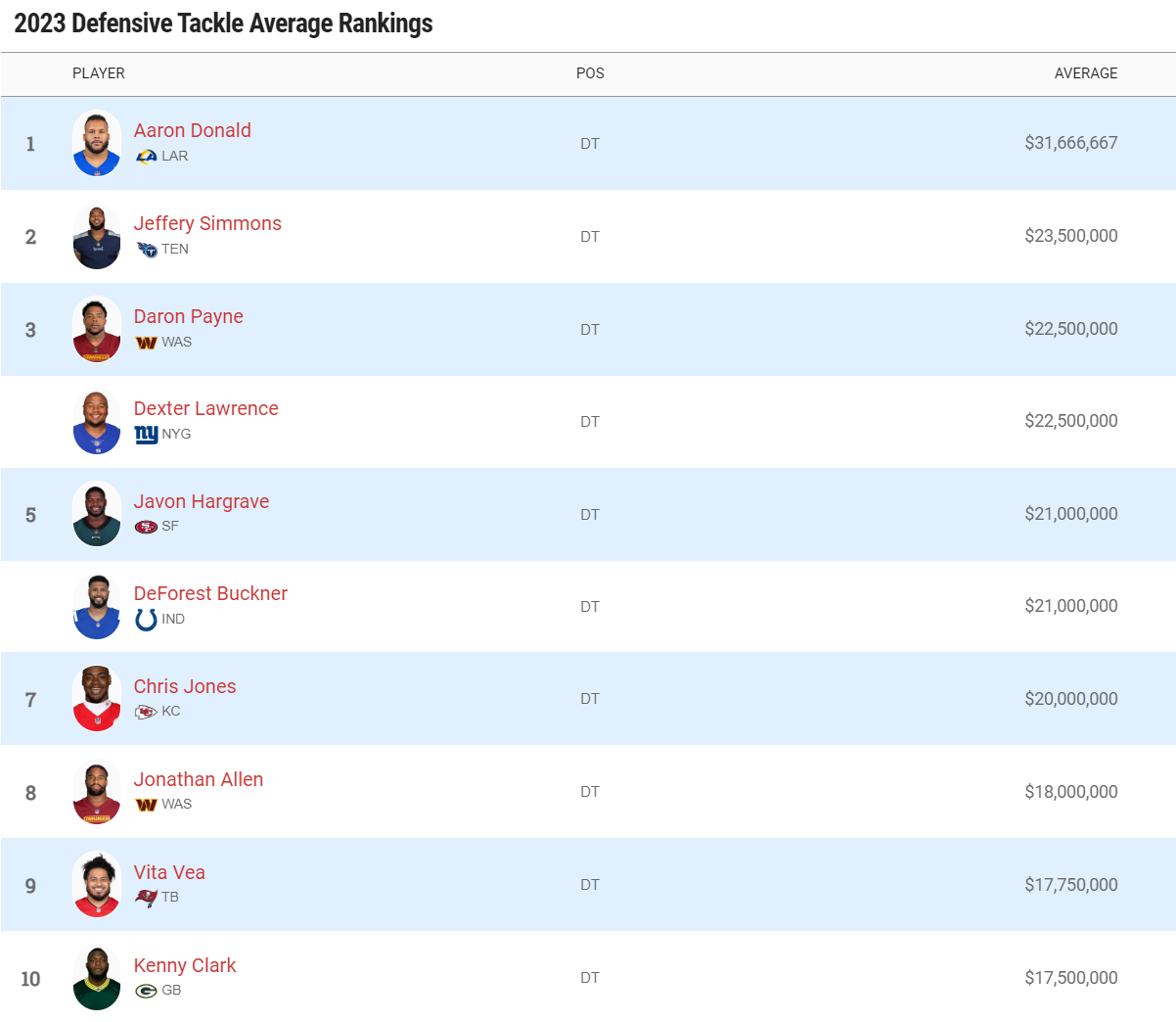 Le contrat de Sexy Dexy s’élève à $90M sur 4ans avec 60M$ garantis. Cela fait un total de $22.5M par an avec $60M garantis. C’est exactement le même contrat que Daron Payne de Washington avec qui l’on vient de faire la comparaison statistique. Cela place les deux hommes en 3ème position ex aequo des DT les mieux payés de la ligue en salaire moyen.