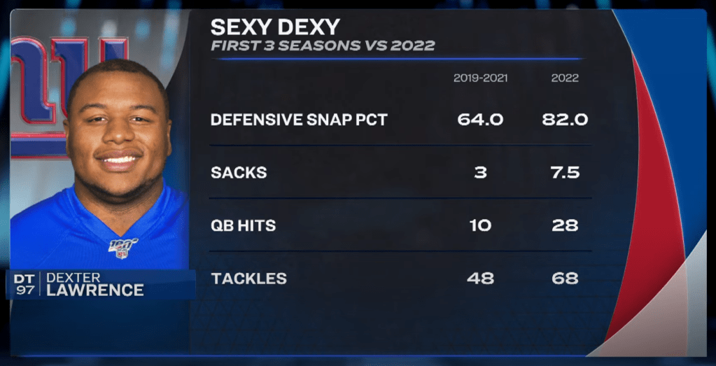 La comparaison la plus évidente est à réaliser avec Daron Payne qui a signé un contrat très similaire à celui de Dexter Lawrence. En 2022, Payne a totalisé 11.5 sacks / 20 QB Hits / 64 plaquages pour 87% des snaps joués. On notera tout de même que Daron Payne subit environ 53% de doubles teams alors que Dexter Lawrence atteint quasiment la barre des 70% !