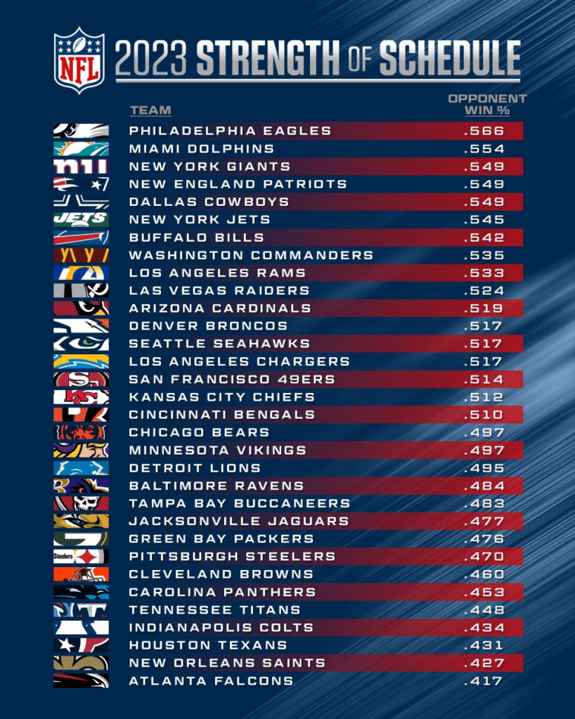 Si l’on regarde du côté de la difficulté du calendrier, nous ne sommes encore une fois pas vernis puisque l’on a le 3ème calendrier le plus difficile de NFL à égalité avec les Patriots et les Cowboys. Ce Strength of Schedule est calculé par rapport au bilan Victoires / Défaites 2022 des équipes que l’on va jouer cette année. Il n’est donc pas étonnant voir toute la NFC Est dans les 8 premières places du classement sachant que l’on se joue tous 2 fois par saison.