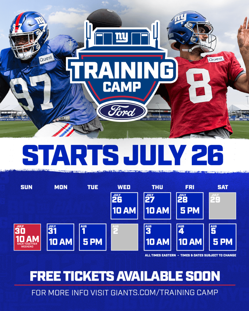 Les Giants ont dévoilé le calendrier du training camp. Celui-ci débutera le 26 juillet avec 9 entrainement ouverts au public. Si jamais vous partez dans les environs pour l’été, vous avez une activité toute trouvée !