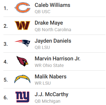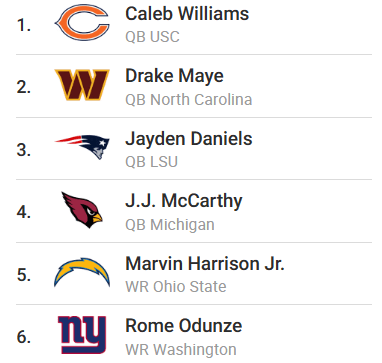 Un scénario qui a l’air fou sur le papier, mais qui semble probable ! Disons que Bears, Commanders et Patriots prennent un QB. Deux possibilités ensuite, les Cardinals ne croient plus en Kyler Murray et prennent aussi un QB. Les Chargers seraient alors trop heureux de choisir Marvin Harrison Jr (WR) suite au départ de Keenan Allen et il est peu probable que les Giants prennent un QB ensuite. Les chances sont alors qu’ils qu’ils visent un receveur et devraient en toute logique s’orienter vers Rome Odunze (WR) ou Malik Nabers (WR). On aurait alors le scénario suivant :