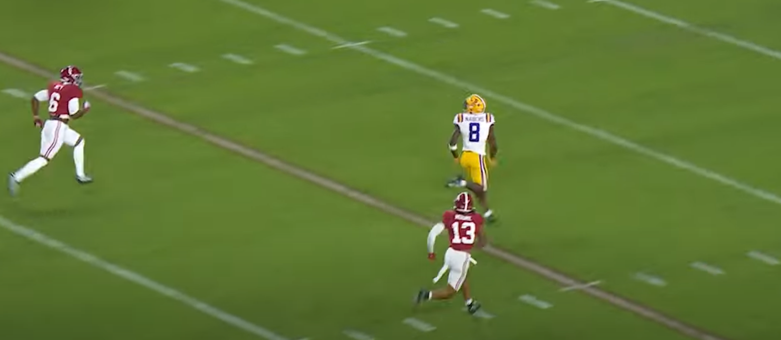Nabers mesure 1.84m et pèse 90kg. Un gabarit qui n’est pas sans rappeler celui d’un certain Hakeem Nicks qui a fait les beaux jours d’Eli Manning à l’époque. Il a été chronométré à 4.35 secondes sur le 40 yards dash, mais sa vitesse en jeu semble encore supérieure. C’est en effet sa principale qualité : se démarquer et mettre ses adversaires à 5 yards de distance. C’est extrêmement flagrant lorsque l’on regarde ses highlights. A plusieurs reprises, le DB qui se trouve à 5 ou 10 yards de distance pour garder un coussin de sécurité, se retrouve au final 5 yards derrière pris par les feintes et la vitesse de Nabers. Exemple sur l’image ci-dessous contre Alabama : au départ de l’action de DB est à 8 yards de distance… mais se retrouve complètement dépassé et Nabers marque un touchdown au final assez facile.