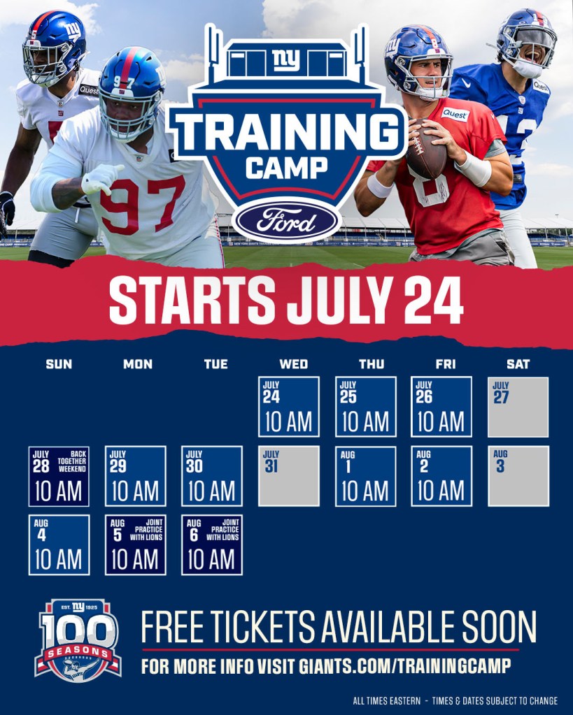 Plus que quelques semaines avant que les joueurs ne soient définitivement de retour sur le terrain. La date du début du training camp est en effet fixée au 24 juillet au matin, et l’entrainement conjoint avec les Lions aura lieu le 5 et 6 aout. On notera que des billets sont disponibles gratuitement pour assister à certaines journées de training camp, donc si vous avez prévu de passer à New-York cet été, tentez votre chance, ça devrait valoir le détour !