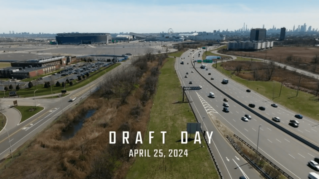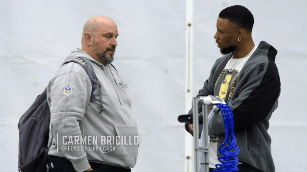 Le premier pro day mis en avant est celui de Penn State. On y voit Carmen Bricillo, notre nouveau coach de ligne offensive, discuter avec Saquon Barkley (qui pour rappel vient de Penn State) des nouvelles recrues sur la Oline. Bricillo parle notamment de Runyan et Eluemunor dont il dit le plus grand bien après l’avoir coaché à Vegas, il dit même : « C’est mon enfant« . Deux autre scouts discutent de Theo Johnson, le Tight End qui vous le savez, finira par être drafté chez nous. Ils disent notamment qu’il va continuer de s’améliorer, que c’est un prospect sûr qui a coché toutes les cases, avec une vitesse improbable pour un physique comme le sien.