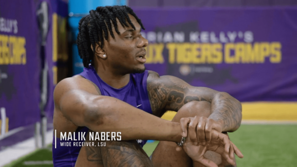 Sur la séquence suivante, les Giants reçoivent dans leurs locaux, au 1925 Giants Drive, plusieurs joueurs qu’ils vont potentiellement drafter au 1er tour, pour continuer de mieux les connaitre. Nous avons tout d’abord trois wide receivers, toujours les mêmes, à savoir Harrison Jr. – Nabers – Odunze. Ils sont reçus tous les trois en même temps par Mike Groh, le coach des wide receivers. Il leur pose notamment des questions tactiques pour voir comment ils réagissent, avec Mike Kafka au fond de la salle qui observe la scène. Mais c’est surtout l’échange entre Mara et Groh qui arrive juste derrière qui est intéressant. Mara demande à Mike Groh qui il choisirait entre les trois joueurs. La réponse est claire : « Je prendrais Nabers« . Malik Nabers faisait donc clairement partie des favoris depuis longtemps sur la liste des Giants, et c’est plutôt bon signe.