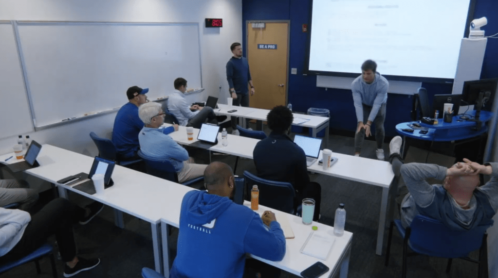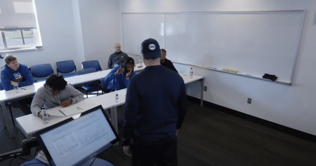 On voit ensuite quelques images des différents quarterbacks, eux aussi reçus dans les locaux des Giants, soit en entrevue rapprochée avec Shoen et Daboll, soit en réunion plus spécifique avec l’ensemble du staff comme sur l’image ci-dessous ou Drake Maye simule un décompte de snap.
