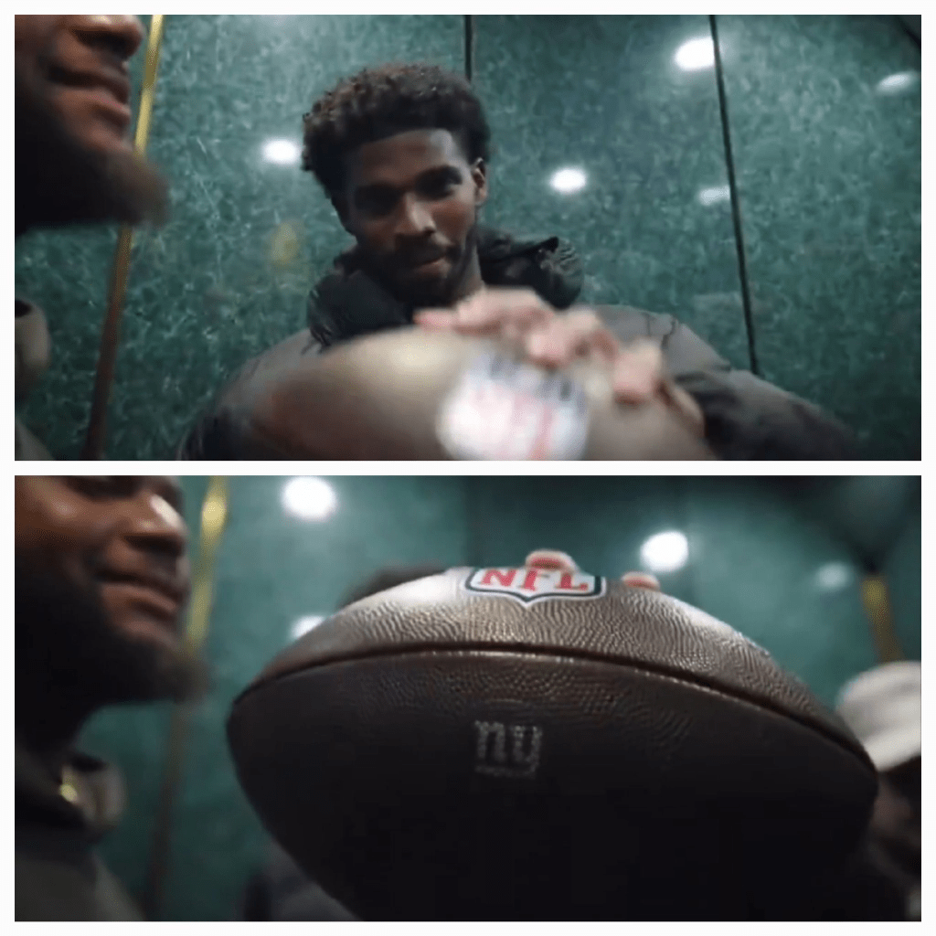 De plus, sur une autre vidéo a priori prise au même moment, il arbore fièrement le ballon avec lequel ils ont joué, floqué d’un joli logo Giants encore une fois :