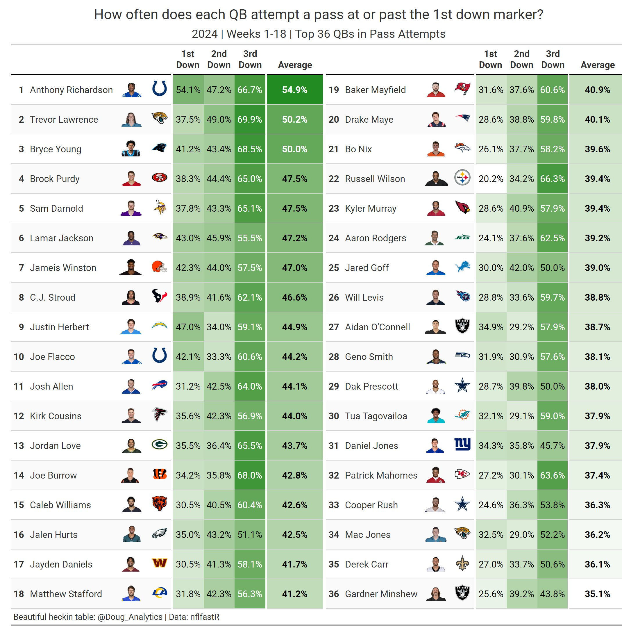 Une autre caractéristique de Winston est qu’il va souvent privilégier le jeu long au jeu court. Comme l’a partagé Doug Analytics, l’an passé il était 7ème de la ligue sur 36 joueurs en pourcentage de passes qui dépassent le marqueur de premier down. Regardez où se situait notre bon vieux Daniel Jones… 31ème ! En terme d’agressivité, la différence est flagrante.