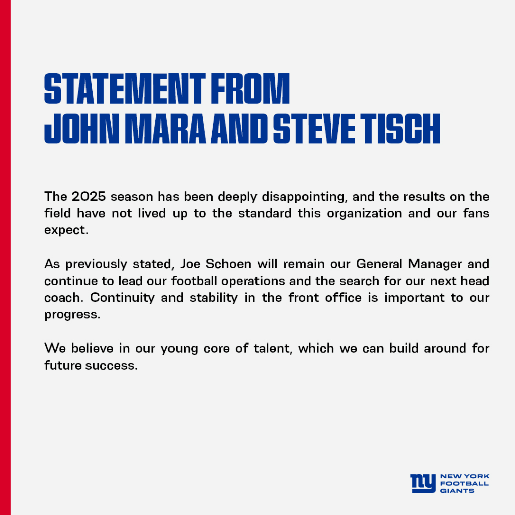 C’est désormais officiel, Joe Schoen, le General Manager des Giants depuis 2022, sera bien de retour l’an prochain pour la saison 2026-2027. D’abord annoncé par Jordan Raanan, l’information a été ensuite confirmée par un communiqué officiel :